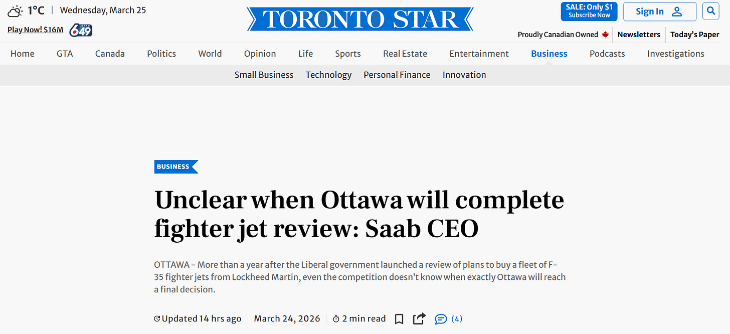 I took the liberty of sending this piece to my MP who is a Liberal. Not a cabinet member, unfortunately. However her constituency (and the city in which I live) includes a large air base. Not as large as it once was, but it still might have some weight. Perhaps others might do the same. (My cover letter indicated that we shouldn’t be supporting the bloated military-industrial complex of a country that wishes to annex us; and that Narayan is a brilliant strategist.)